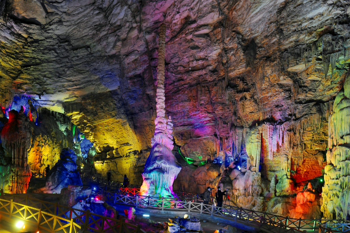 龙缸天坑的雄奇尚未尽收眼底,其附近龙洞便接续展现喀斯特的地下奇观,天坑的地上险峻与龙洞的地下精巧,构成云阳世界地质公园喀斯特地貌的一体两面。龙洞坐落于云阳清水乡8组三叠系嘉陵江组石灰岩地层,因民间传说洞中有龙而得名。其洞口位于溶蚀槽谷,洞内发育有丰富的石钟乳、石笋、石柱、石幔、石瀑等岩溶景观。龙洞由前后两处大厅构成,前厅呈圆形,长200米、高20米,面积达4 800平方米;后厅为五边形,高30米,面积近6 000平方米。除了极具观赏价值的岩溶景观,龙洞凭借其稳定的内部环境,呈现出冬暖夏凉的特征。