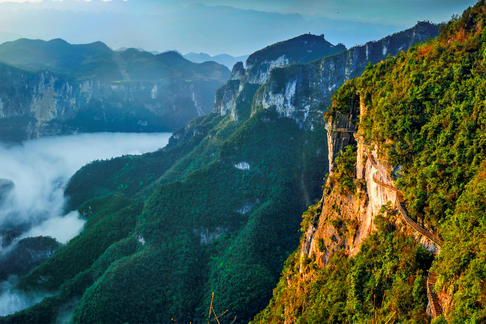 一缸独立横绝巅,天梯石栈相钩连。如果有机会到云阳龙缸天坑,漫步在云端栈道上,就会发现目之所及是云雾与光影的博弈,展现了宏观地貌的壮美。作为云阳世界地质公园的核心景观,龙缸天坑是集科研、美学与研学价值于一体的地质瑰宝,是自然教育与文旅体验的绝佳载体。