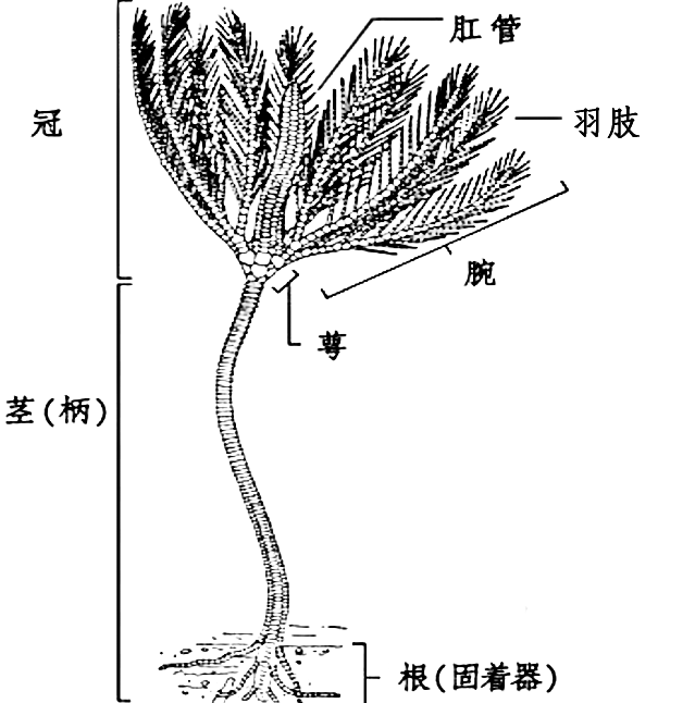 尽管海百合被归类为动物,但生物学家在描述其身体结构时,通常将其划分为三个部分:冠、茎和根。这些部分共同构成了海百合那令人叹为观止的摇曳身姿。