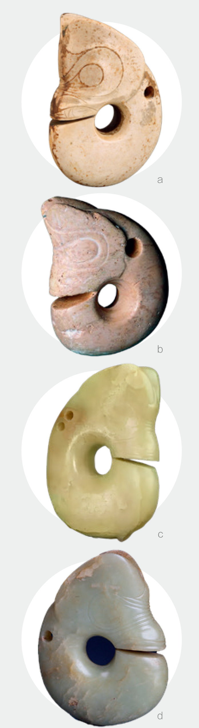 这些玉器在造型上呈现明显共性特征:躯体蜷曲为“C”形,首尾相近或相接;头部比例较大,吻部前突,双耳呈三角形竖立;面部以阴线刻画出圆眼、鼻与微张的嘴部,形态似猪;颈部常钻有一孔,用于穿系。