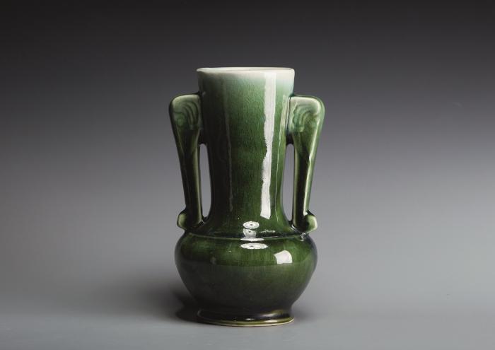 透过玻璃,夏日明亮的阳光,温柔地飘落在一个标记为“温宏远作品”的宝葫芦瓶上。葫芦的上半部分,乳白色苍茫的大海之上,一孤独的蓑笠老翁背对着我,安静地坐在海边。他那佝偻却坚实的背影,好像一个优哉游哉的渔夫,哼着歌谣消磨自由而富足的时光,又似无饵垂钓的姜老太公,静坐于渭水河边,等待着那个贤明君主的缓缓到来。老翁一袭紫衣,上浅下深,肩膀宽厚,坐姿稳重。看不见他面朝大海的眼神,只能透过瓷胎的釉面,让那紫红与奶白交织的凝聚,去反射,去体味他盈尺之间潜藏的目光,与波光粼粼或冰霜铿锵的北极航线同样的坚毅和辽远。葫芦的下半部分,大圆肚子以紫红釉为主。青白色的部分,恍若一头慈祥的奶牛,或一只怀孕的母豹,默默地站在夜里,或慢腾腾地走进森林……