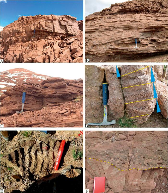 交错层理由一系列斜交层系界面的纹层组成,主要是在水和风等流动介质作用下形成,常见于碎屑岩地层中。根据纹层形状、纹层与层系界面以及层系的组合特征,可将交错层理分为板状、楔状及槽状等多种类型,它们对沉积环境具有指示意义。方湖及胜利河等地区雀莫错组红层中发育大量板状交错层理及槽状交错层理,这些交错层理多见于砂岩中,细层厚度通常为1 ~ 3厘米,层系厚度为10 ~ 25厘米,规模中等,多指示水体浅而动荡的河流环境。古流向为15° ~ 25°,指示沉积物源主要来自南部。