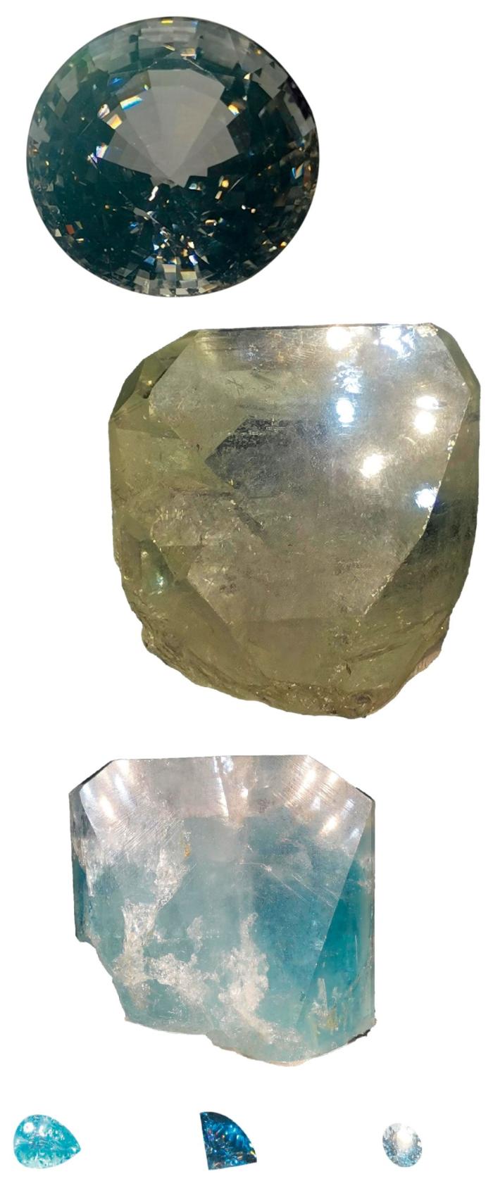 托帕石是英文“topaz”的音译,其矿物名称为黄玉,因易与黄色软玉或水晶混淆,珠宝商贸中便普遍使用其音译名称。托帕石是一种有悠久历史的宝石品种,其常见的色彩有无色、蓝色、黄色、粉色、褐色等,有时也会像西瓜碧玺一样在同一块标本中出现两种色彩,其中一种多彩变种便是彩虹托帕石,这种托帕石在阳光下会呈现彩虹般的色彩,因而被人们形象地称为彩虹托帕石。